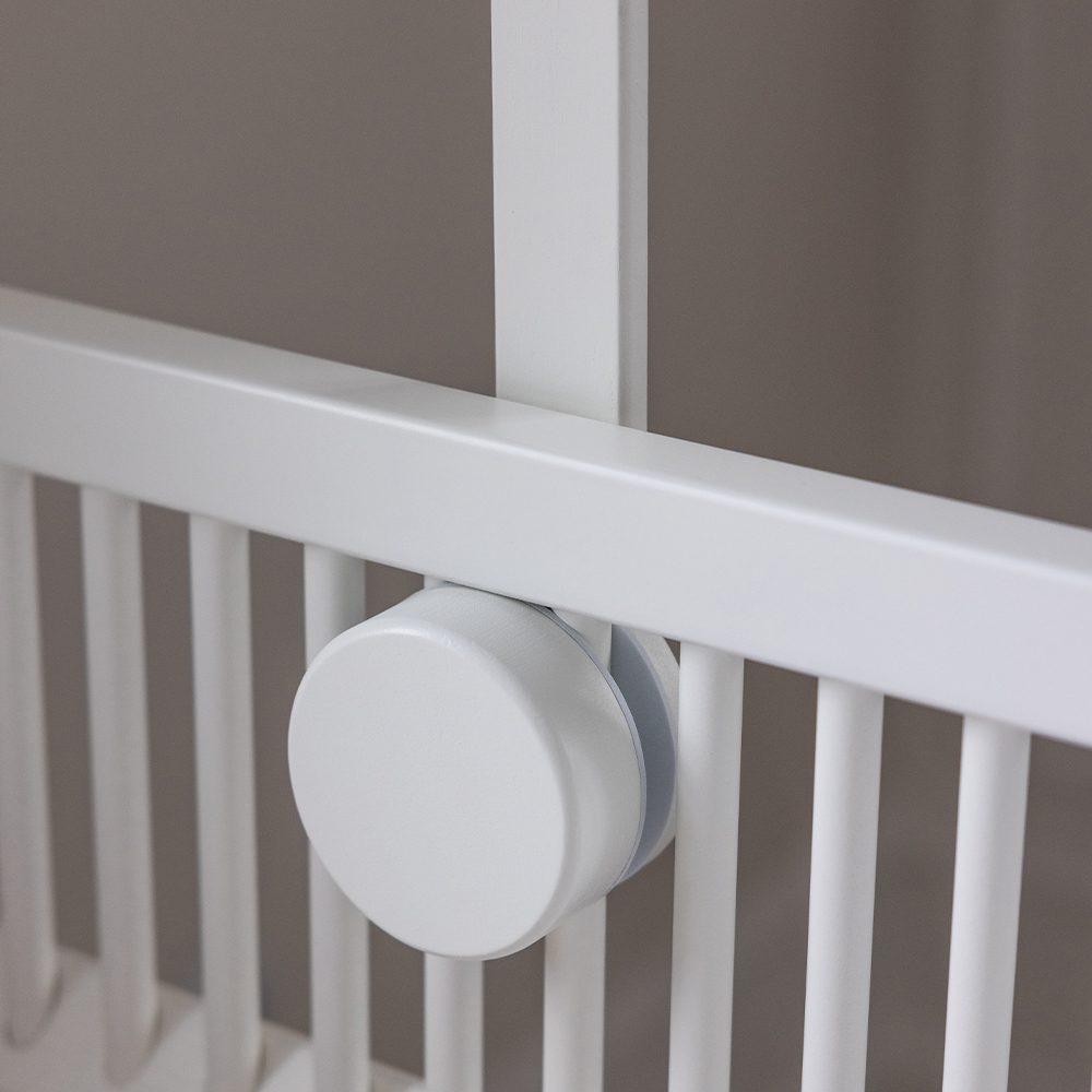 Om de mobielhouder te kunnen monteren moet de breedte tussen de stangen waar de houder wordt gemonteerd minimaal 8 mm zijn, zodat de schroef van de mobielhouder erdoor kan. De schijven hebben een beschermlaag die het hout van het babybed beschermen tegen beschadiging.