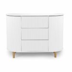 Het dressoir heeft twee kasten met planken en drie ruime lades, allemaal met easy touch die je met je handen, heupen, knieën met een klein duwtje kunt openen en sluiten, wat makkelijk is als je je handen vol hebt.