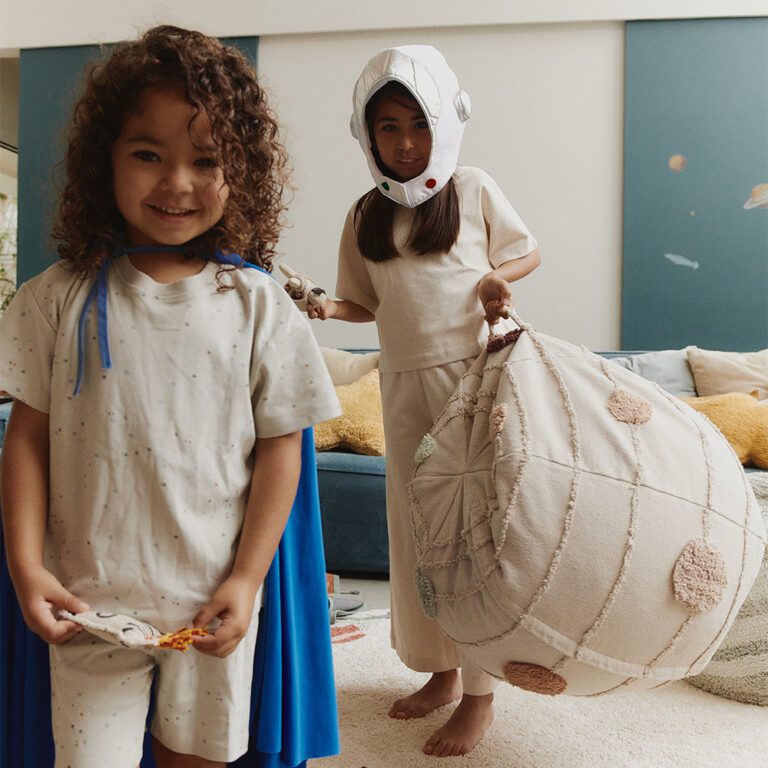 De Mom, I want to be an astronaut collectie van Lorena Canals is geïnspireerd op de ruimte en ontworpen voor avontuurlijke kinderen. De collectie bestaat uit handgemaakte, wasbare producten zoals vloerkleden, opbergmanden en decoraties, met ontwerpen van raketten, UFO’s, en astronauten. De producten zijn duurzaam gemaakt van gerecyclede materialen, zoals katoen en PET-flessen, en zijn kindvriendelijk en milieuvriendelijk. De thema’s zijn kleurrijk en speels, ideaal om de fantasie van kinderen te prikkelen terwijl ze hun eigen ‘kosmische’ ruimtes creëren.
