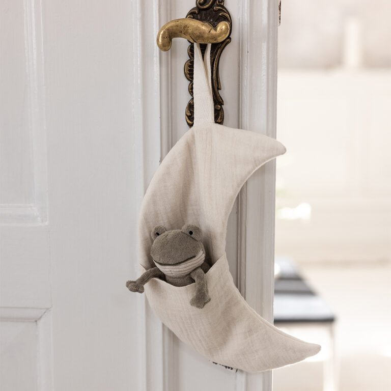 Dit schattige, maantje is niet alleen een lief decoratief detail, maar ook een praktisch opbergvakje voor in de babykamer. Het zachte zakje is perfect om fopspenen, kleine knuffels of andere essentiële spulletjes binnen handbereik te houden.