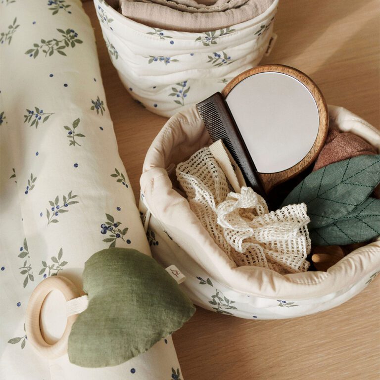 Deze set bestaat uit een ronde en een ovale mand, beide gemaakt van zacht gewatteerd materiaal met een golvend stiksel. De opstaande rand kan omgevouwen worden, zodat je makkelijk bij de inhoud kunt. Elk mandje heeft een lusje om ze eenvoudig op te hangen. Ideaal om kleine spullen overzichtelijk en stijlvol op te bergen in de babykamer.