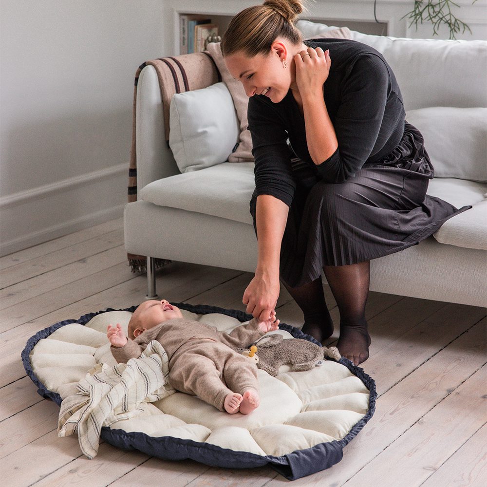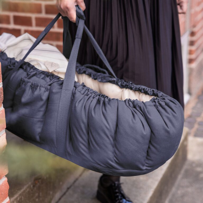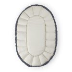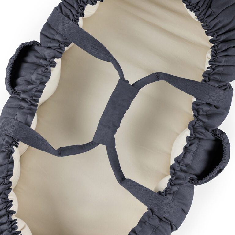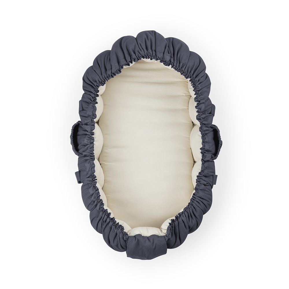 Gevuld met kapok, een natuurlijke vezel met antibacteriële eigenschappen, is het ideaal voor mensen met allergieën en biedt het uitstekende warmteregulering. Het nestje heeft veilige handvatten die aan elkaar geklikt kunnen worden voor veilig dragen en twee zijvakken voor essentiële spullen. Het past perfect in kinderwagens en vervangt traditionele reiswiegen en wanneer de zijkanten zijn ingeklapt, dient het als een speelmat.