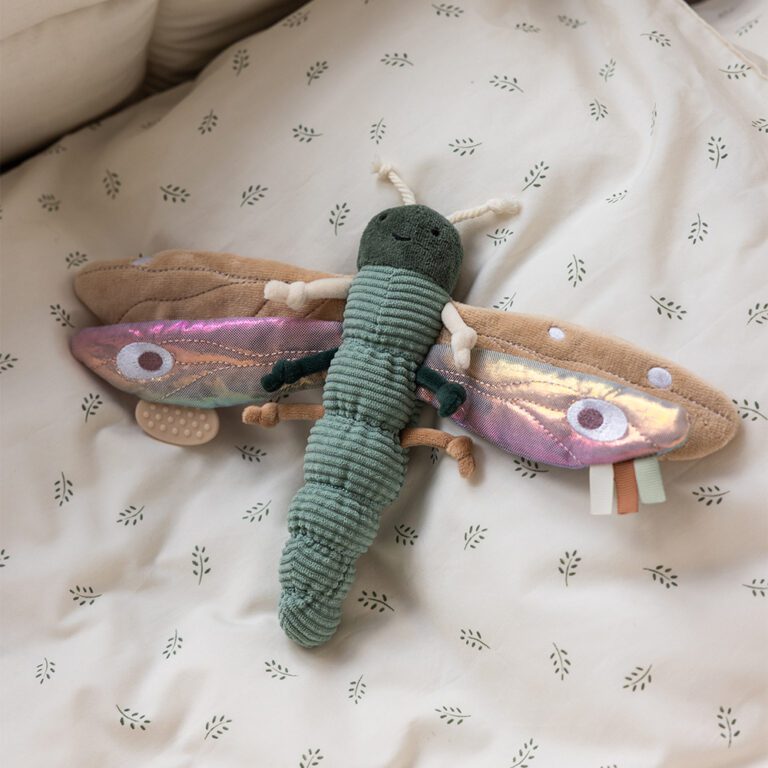 Deze zachte, rammelende libelle is meer dan alleen een speeltje, ze is vol verrassingen die kleine handjes uitnodigen om te ontdekken. Haar vleugels maken een zacht rammelgeluid en zijn versierd met glinsterende stof en tastbare details, die de zintuigen en fijne motoriek stimuleren. Aan een van de vleugels zit een zachte bijtring, perfect om pijnlijk tandvlees te kalmeren tijdens het doorkomen van tandjes.