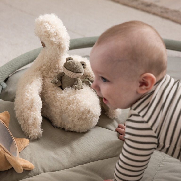 Deze zachte zwaan is een echte avonturier! Op zijn rug neemt hij een kleine kikker mee, die je eraf kunt halen en schudden voor een vrolijk geluid. En onder een van zijn vleugels schuilt een zoemende bij, verstopt in een handig vakje, klaar om ontdekt te worden door nieuwsgierige handjes. De zwaan is niet alleen een knuffel, maar ook een speelse uitdaging. Haar vleugels kun je vastmaken met klittenband, zodat ze klaar is om op avontuur te gaan. Terwijl je kindje de kikker en de bij vindt, grijpt, schudt en verstoppertje speelt, worden de fijne motoriek en zintuigen gestimuleerd. Zo leert je baby spelenderwijs over verstoppen, terugvinden en oorzaak-gevolg.