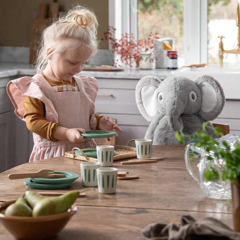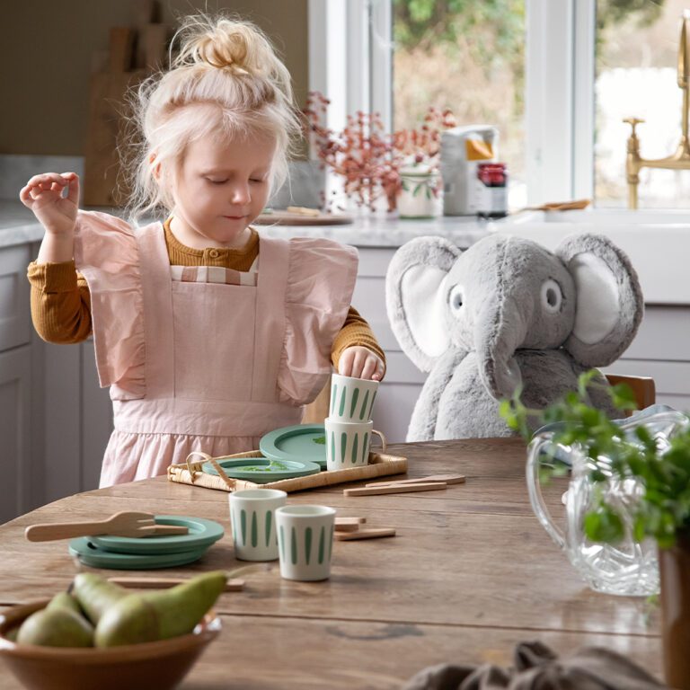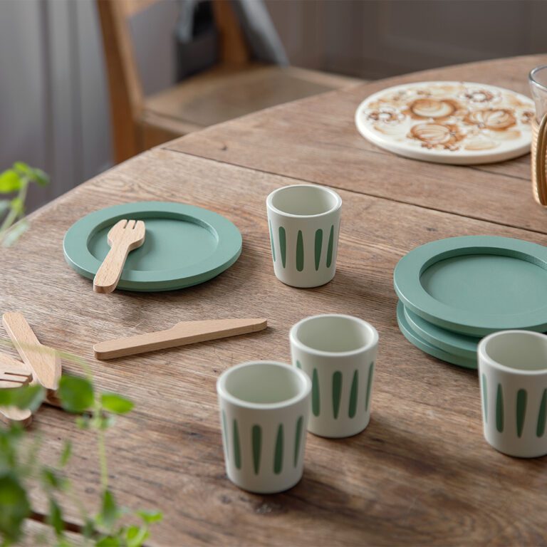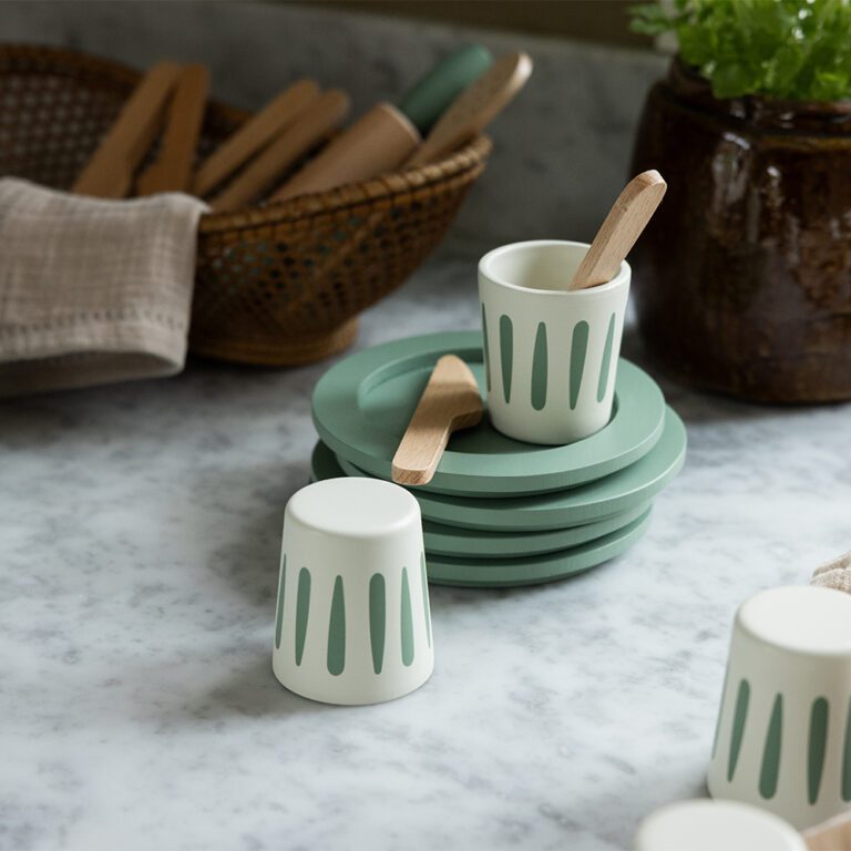 Laat de fantasie pruttelen met deze prachtige houten serviesset, perfect voor rollenspellen zoals ‘restaurantje spelen’ of het organiseren van denkbeeldige maaltijden. Gemaakt van hoogwaardig, FSC-gecertificeerd hout en ontworpen in Denemarken, combineert deze set stijlvol design met duurzaam speelplezier.