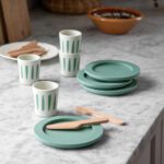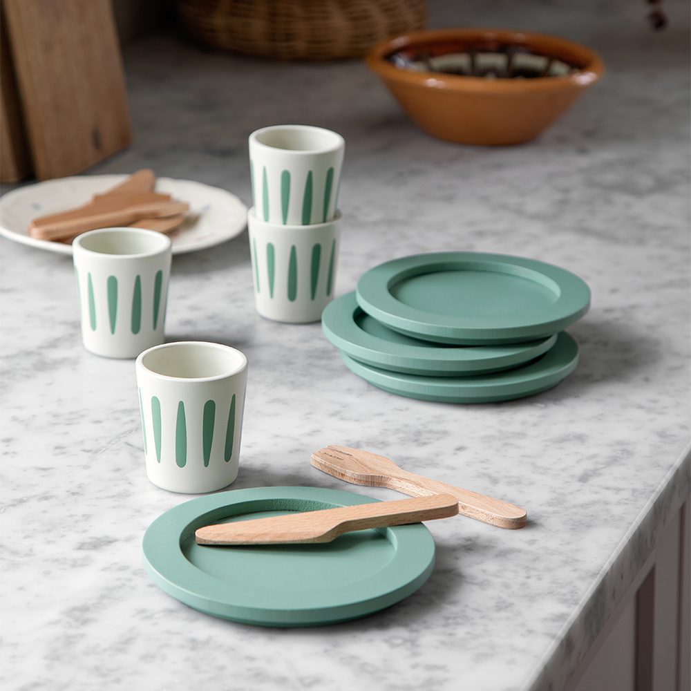 De set bestaat uit alle onderdelen die kleine koks en gastheren nodig hebben: vier borden, vier bekers en vier besteksets. Zo kunnen kinderen op een realistische manier eten serveren, terwijl ze spelenderwijs hun fijne motoriek, sociale vaardigheden en creativiteit ontwikkelen.
