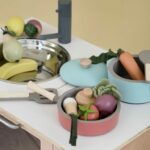 Deze set heeft alles wat de kleine chef-kok nodig heeft om aan de slag te gaan in de speelkeuken. Deze hoogwaardige stukken groente van hout zijn geschikt voor denkbeeldige spellen en rollenspellen. De set bestaat uit een wortel, een paddenstoel, een tomaat, een prei en een rode biet en ze zijn verpakt in een gehaakt touwtje. Alle artikelen zijn behandeld met niet-giftige verf.