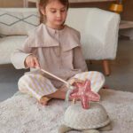 We zwemmen mee op de rug van mevrouw Turtle en ontdekken de wonderen van de oceaan. Laat je verrassen door de vormen en kleuren van de zeewonderen en een beetje fantasie doet de rest. Deze collectie laat de schoonheid van de wereld onder water zien door middel van zachtgekleurde tapijten met interactieve ontwerpen en speelgoed van textiel.