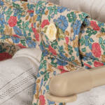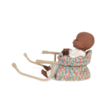 Poppentafelstoel gemaakt van gewatteerd biologisch katoen met een ijzeren frame. Eenvoudig aan de tafel te bevestigen. Ontworpen met schulpranddetails.