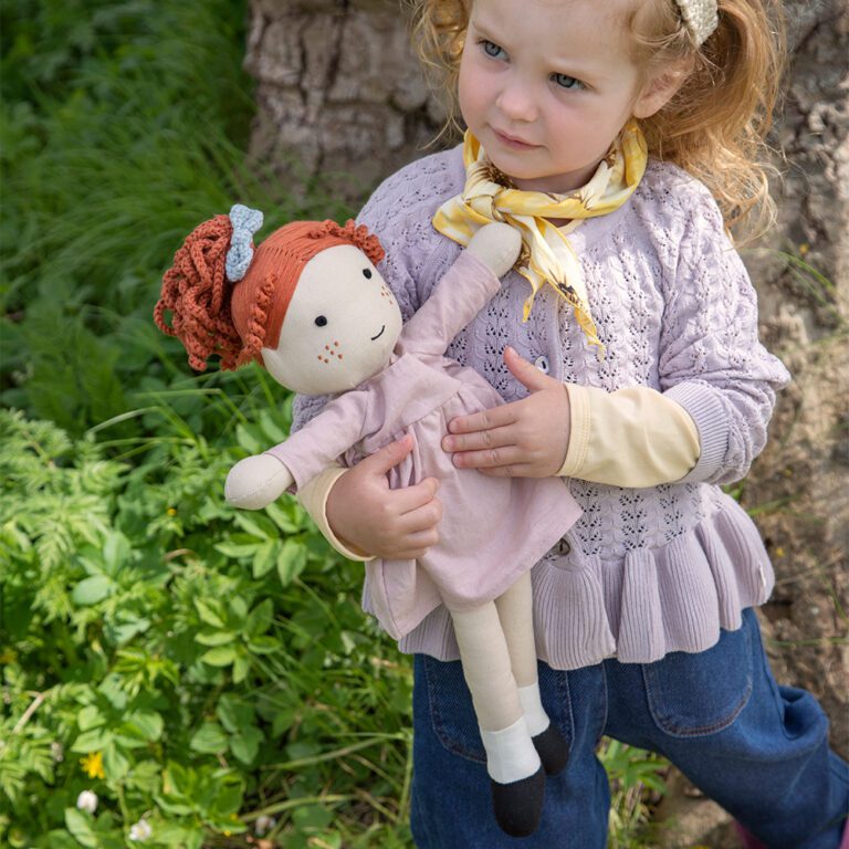 Met haar zachte jurkje, handgemaakte lokken en vrolijke sproetjes is Hanna de ideale speelkameraad voor elk kind. Deze 43 cm grote stoffen pop, gevuld met zacht gerecycled polyester, nodigt uit om te knuffelen, te verkleden en mee te nemen op avontuur. Haar jurkje is eenvoudig aan- en uit te trekken, zodat je kleintje zelf kan bepalen hoe Hanna er vandaag uitziet.