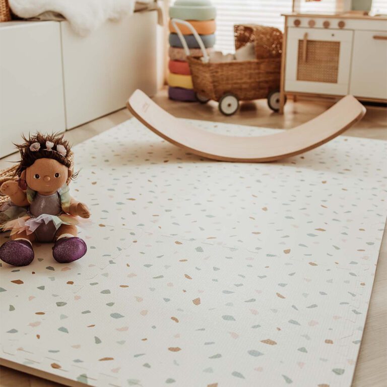 De EEVAA speelmat is zoveel meer dan een gewoon speelmat. Aan beide zijden bedrukt, biedt hij een kleurrijk en fantasierijk ontwerp dat kinderen uitnodigt tot eindeloos denkbeeldig spel. Draai je de mat om, dan verschijnt een stijlvol en subtiel patroon dat perfect in elke woonkamer past. Na het spelen transformeer je de mat in een handomdraai tot een stevige opbergdoos waarin al het speelgoed netjes opgeborgen kan worden.