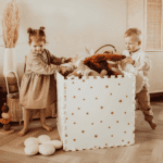 De EEVAA speelmat is zoveel meer dan een gewoon speelmat. Aan beide zijden bedrukt, biedt hij een kleurrijk en fantasierijk ontwerp dat kinderen uitnodigt tot eindeloos denkbeeldig spel. Draai je de mat om, dan verschijnt een stijlvol en subtiel patroon dat perfect in elke woonkamer past. Na het spelen transformeer je de mat in een handomdraai tot een stevige opbergdoos waarin al het speelgoed netjes opgeborgen kan worden.