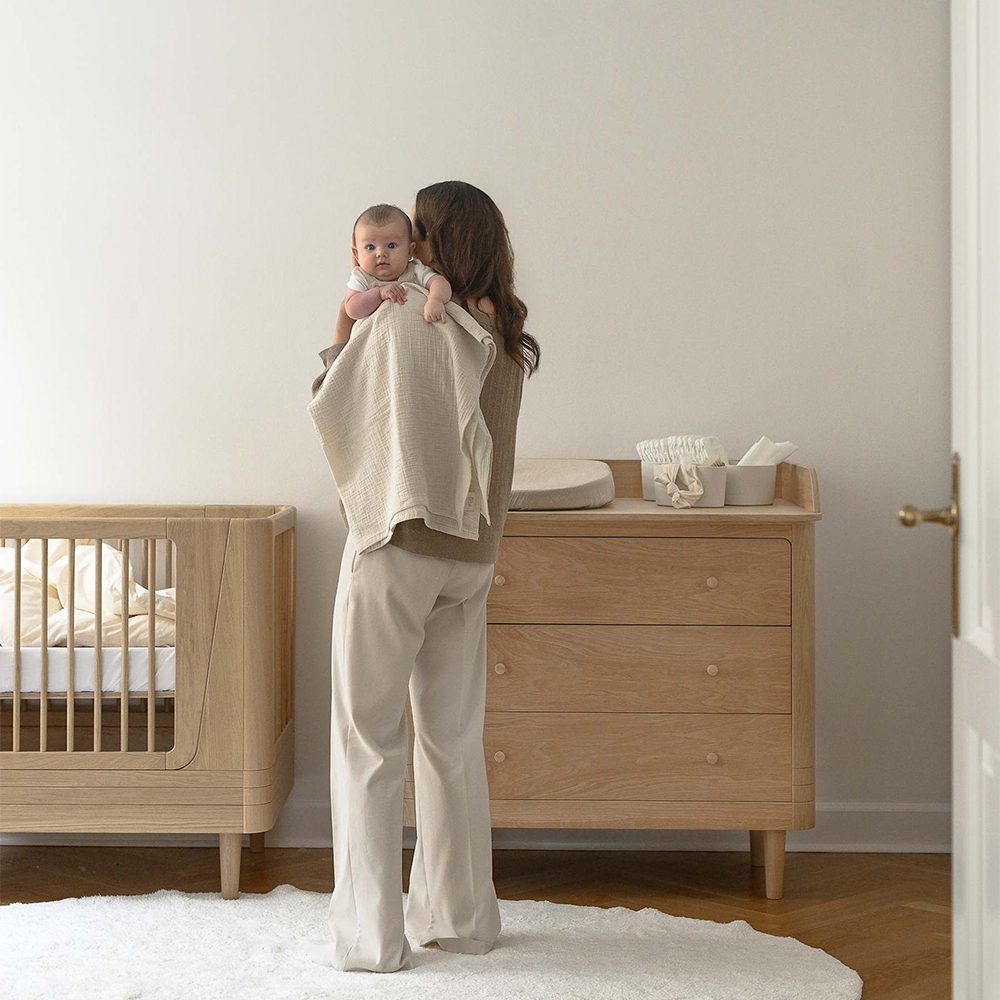 De doek is gemaakt van 100% biologisch katoen, wat heerlijk zacht aanvoelt en geschikt is voor de gevoelige babyhuid. Het lichte, ademende materiaal maakt het zowel comfortabel als praktisch voor dagelijks gebruik. Dankzij het tijdloze ontwerp past de doek naadloos bij iedere babyuitzet.